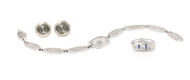 consisting of a 14 karat filigree link bracelet containing a central frosted camphor glass and old European cut diamond links, together with a pair of engraved converted metal earrings signed Krementz, together with an 18 karat filigree ring containing three round single cut diamonds and two baguette cut sapphires.Stamp: 14K.Stamp: KREMENTZ.Stamp: 18K.