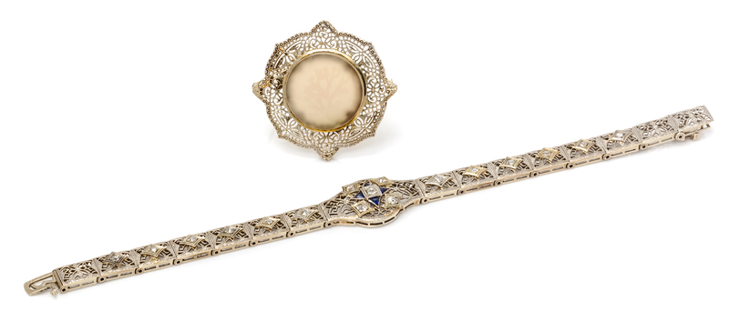 consisting of a filigree brooch containing one round agate plaque, together with a filigree bracelet containing old mine cut diamonds and four French cut synthetic sapphires.