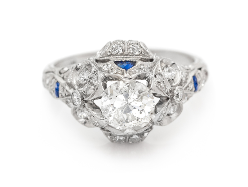 containing one round transitional brilliant cut diamond weighing approximately 0.90 carat, 56 round brilliant and round single cut diamonds weighing approximately 0.52 carats total, and six synthetic sapphire accents in an intricately hand engraved openwork setting.Stamp: PLATINUM.