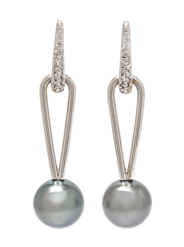 A Pair of 18 Karat White Gold, Cultured Tahitian Pearl and Diamond Earrings, Kurt Wayne,