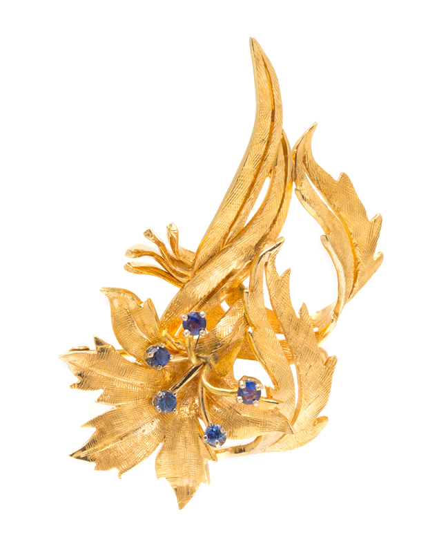 A 14 Karat Yellow Gold and Sapphire Lily Motif Brooch,