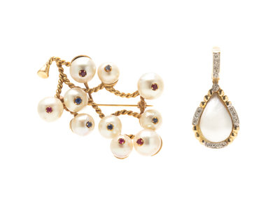 consisting of a pendant/brooch containing ten pearls measuring approximately 8.27-10.06 mm, five round mixed cut sapphires and five round mixed cut rubies, together with 14 karat gold enhancer/pendant containing one pear shaped mabe pearl and 18 round brilliant cut diamonds weighing approximately 0.18 carat total.Stamp: 14K.