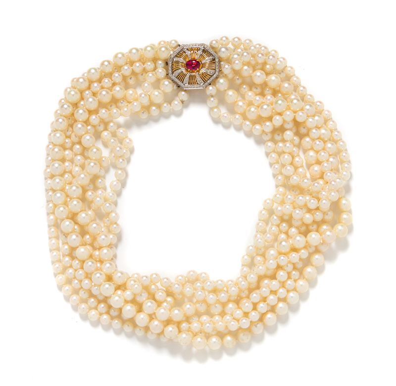 consisting of nine strands containing numerous pearls measuring approximately 6.50-8.80 mm in diameter strung knotted with a yellow gold clasp containing 80 round brilliant cut diamonds weighing approximately 0.40 carat total and one oval mixed cut pink tourmaline measuring approximately 9.08 x 6.67 mm.Stamp: 14K 585 (maker's mark of CW).
