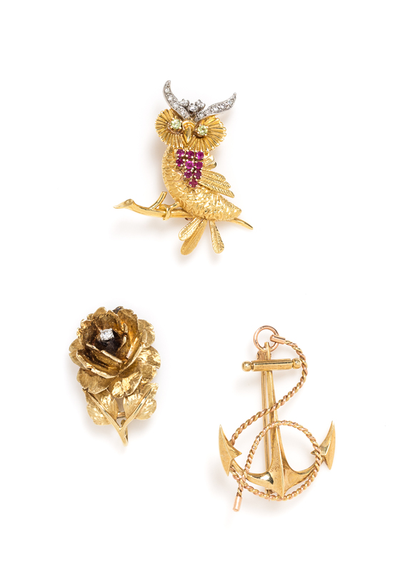 consisting of a 14 karat foliate brooch containing one round brilliant cut diamond, an anchor brooch, together with an 18 karat ruby, diamond and peridot owl brooch.