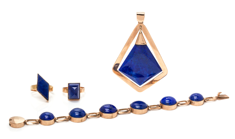 consisting of a pendant suspending a kite shaped lapis lazuli tablet, a bracelet containing six round cabochon cut lapis lazuli, a ring containing one rectangular mixed cut lapis lazuli together with a ring containing a navette shape lapis lazuli tablet.