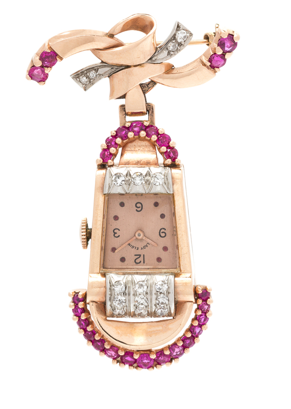 20.00 x 16.00 mm case dimensions, matte rose gold dial signed LADY ELGIN, dot and Arabic numerals, rose gold pencil hands, trapezoid shape case with asymmetric lugs containing 21 round mixed cut rubies weighing approximately carats total and 12 round single cut diamonds weighing approximately 1.39 carat total, snap on case back, manual wind 19 jewel movement signed ELGIN, suspended from a rose and white gold bow brooch containing four round mixed cut rubies weighing approximately 0.41 carat total and four round single cut diamonds.