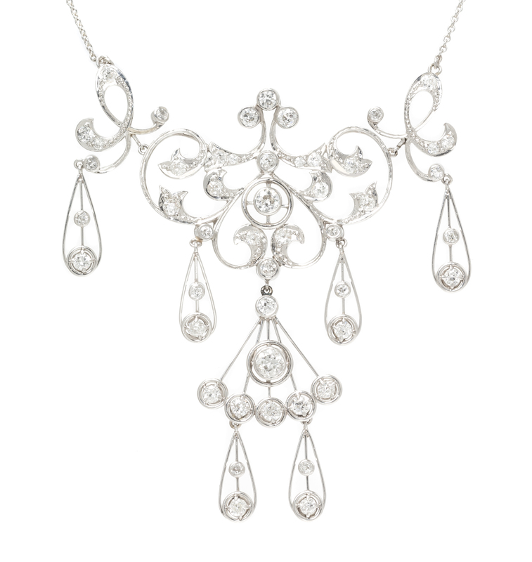the central section composed of open filigree work suspending six pendants and containing 47 old European cut diamonds weighing approximately 3.14 carats total, the center suspended from a platinum chain.