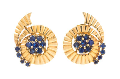 A Pair of Retro Yellow Gold and Sapphire Spiral Ear Clips
