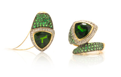consisting of a ring containing one triangular mixed cut chrome diopside measuring approximately 9.70 x 9.70 x 5.35, 111 round mixed cut peridots measuring approximately 1.50 mm in diameter and 24 round brilliant cut diamonds weighing approximately 0.36 carats total together with a matching pendant containing one triangular mixed cut chrome diopside measuring approximately 10.00 x 10.00 x 5.74 mm, 31 round mixed cut peridots measuring approximately 1.50 mm in diameter and 27 round brilliant cut diamonds weighing approximately 0.27 carats total.
