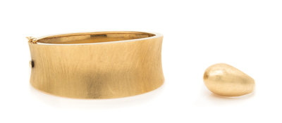 consisting of a concave form brushed textured finish bangle bracelet together with a domed ring in a brushed textured finish.