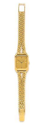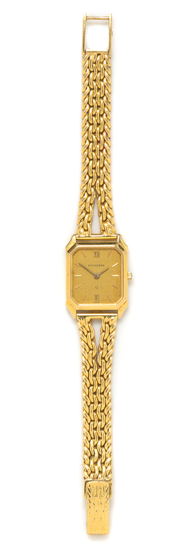 20.00 x 18.00 mm case dimensions excluding lugs, champagne dial signed BUCHERER, applied baton numerals, gold pencil hands, snap on case back, quartz movement, double braided gold link bracelet, foldover clasp.