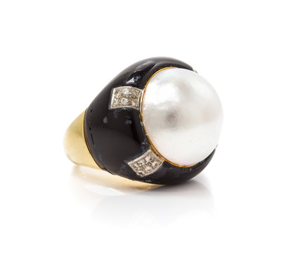 An 18 Karat Yellow Gold, Cultured Mabe Pearl, Diamond and Onyx Ring,
