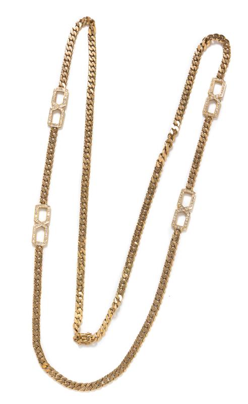 consisting of a curb link chain with four figure-eight shaped link stations containing 156 round brilliant cut diamonds weighing approximately 2.34 carats total.Stamps: 14K 585 C.