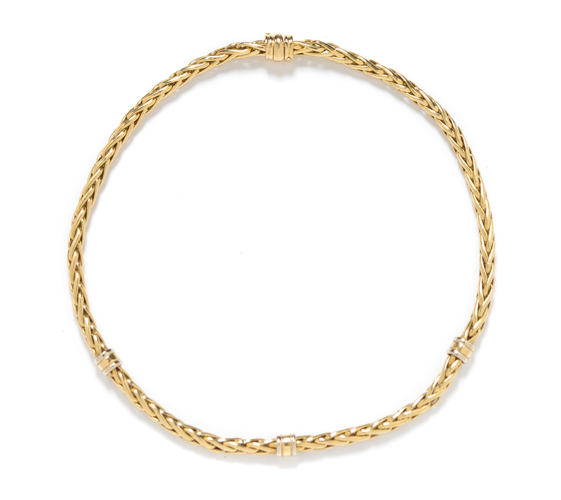 consisting of a woven wheat chain with three polished barrel spacer beads.Stamp: 18Kt ITALY MODA ITALY.