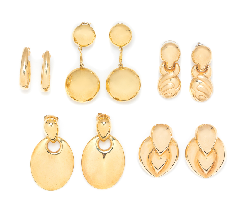 consisting of a pair of 14 karat hoops, a pair of 18 karat round dome drops, a pair of 18 karat oval shaped drops, a pair of 14 karat swirl motif drops, and a pair of 14 karat gold earclips.