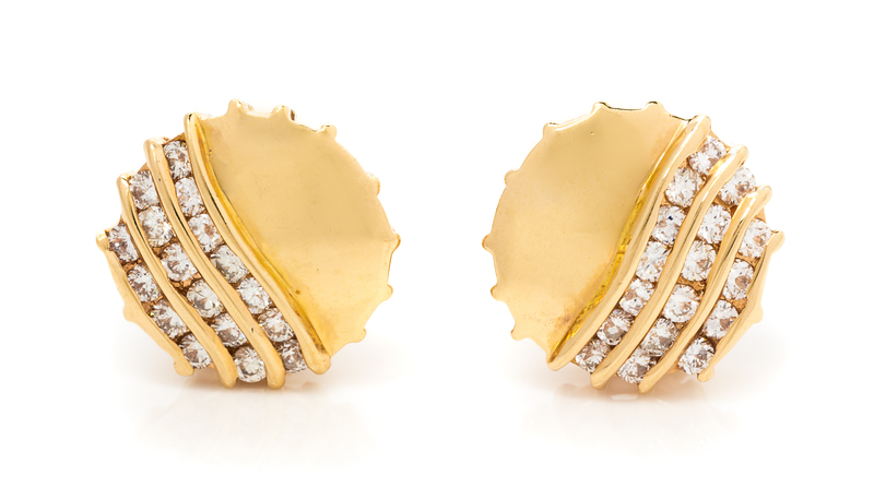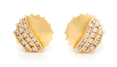 A Pair of 14 Karat Yellow Gold and Diamond Earclips,