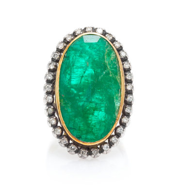 containing one oval rose cut emerald measuring approximately 25.11 x 14.40 x 6.24 mm and 29 round single cut diamonds weighing approximately 0.44 carat total. Stamp: 46787 (rubbed).