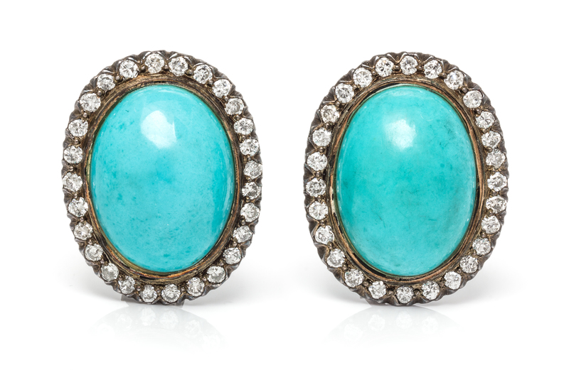 containing two oval cabochon cut turquoise measuring approximately 21.30 x 16.25 mm and 54 round brilliant cut diamonds weighing approximately 2.16 carats total.