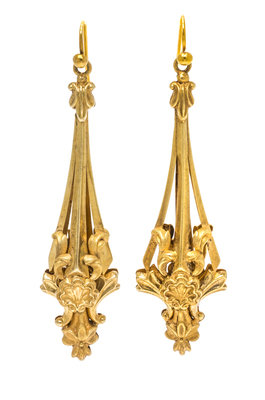 the pendant drop earrings with applied scrollwork and shell motifs measuring approximately 65.00 mm in length excluding earwire.