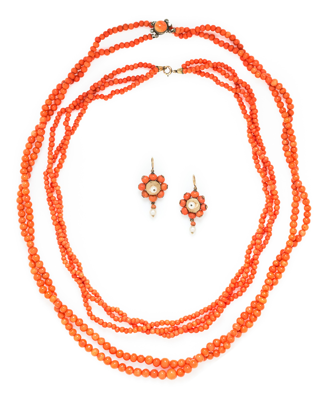consisting of one graduated double strand necklace containing numerous orange coral beads measuring approximately 4.03-7.54 mm in diameter strung with a metal clasp containing one round cabochon cut coral, a triple strand necklace containing numerous coral beads measuring approximately 3.61-4.34 mm in diameter strung knotted with a metal clasp, together with a pair of earrings containing 18 coral beads measuring approximately 3.42-5.23 mm in diameter and four cultured pearls measuring approximately 4.57 mm in diameter.
