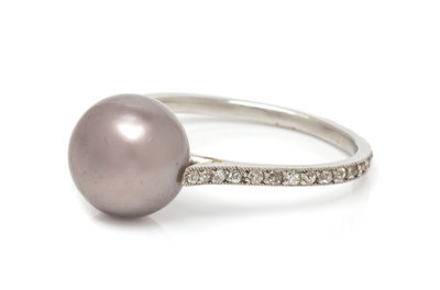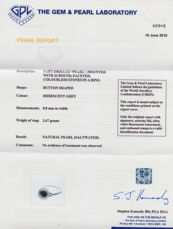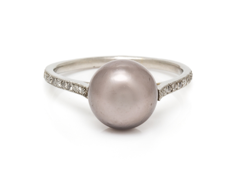 containing one button shape grey pearl measuring approximately 8.80 mm in diameter and numerous round single cut diamonds.Hand inscribed: TIFFANY&CO. (partially obscured scratchmark -514).Accompanied by a Gem & Pearl Laboratory pearl report number 02945, dated June 10, 2010, stating Identification: Natural pearl, Environment: Saltwater, Shape: Button, Colour: Iridescent Grey, Treatments: No indications of treatment.