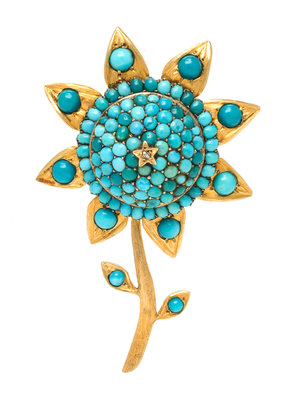 consisting of a central Victorian era silver domed section containing numerous round cabochon cut turquoise measuring approximately 2.55 mm in diameter and one round single cut diamond, the dome set within a yellow gold foliate motif surround of later addition, the petals and leaves containing 10 round cabochon cut turquoise measuring approximately 2.93-4.09 mm in diameter.