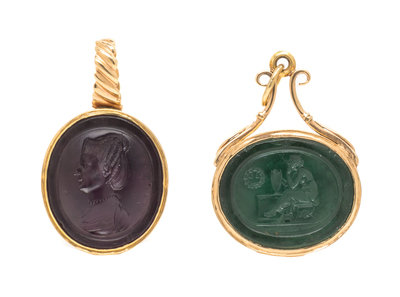 consisting of an oval carved glass intaglio depicting an 18th century female in profile together with an oval carved green glass intaglio depicting a classical figure in a mourning scene.Inscription: PICHLER (in reverse).