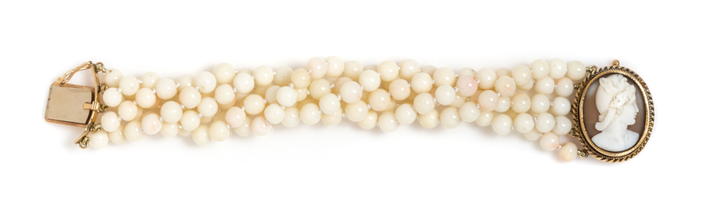 A Yellow Gold, Shell Cameo and White Coral Multistrand Bracelet,