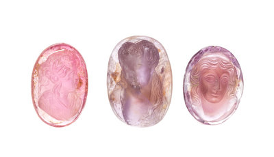 consisting of an oval pink tourmaline depicting a female profile measuring approximately 20.45 x 13.90 mm, an oval amethyst depicting a portrait of a woman measuring approximately 19.50 x 14.85 mm and an oval amethyst depicting the portrait of a woman measuring approximately 22.17 x 15.90 mm.
