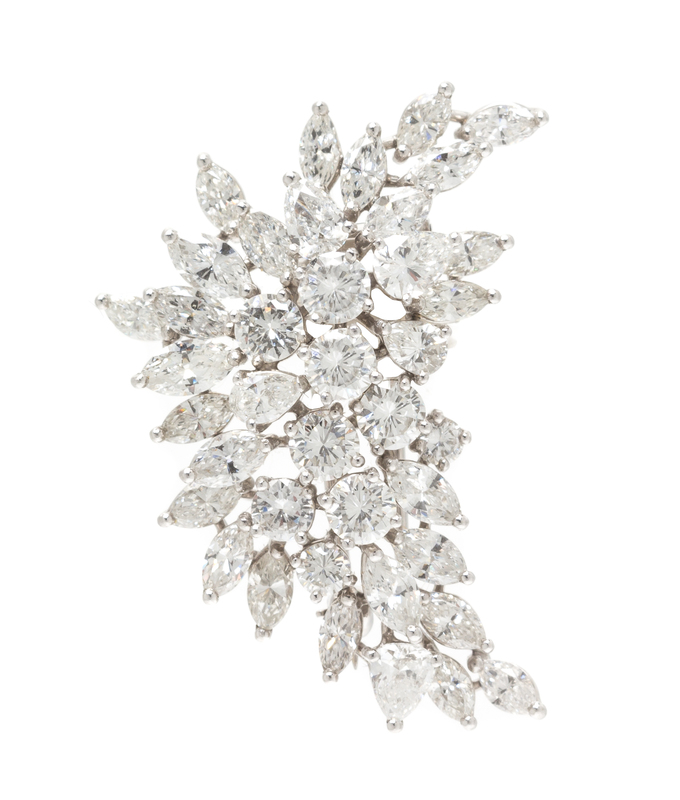 in a crescent shape openwork design containing nine round brilliant cut diamonds weighing approximately 2.37 carats total, 26 marquise cut diamonds weighing approximately 5.60 carats total, and five pear shape diamonds weighing approximately 1.00 carat total.Hand inscribed: (Scratch mark 399).