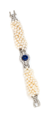 A Platinum, Cultured Pearl, Synthetic Sapphire and Diamond Torsade Bracelet,