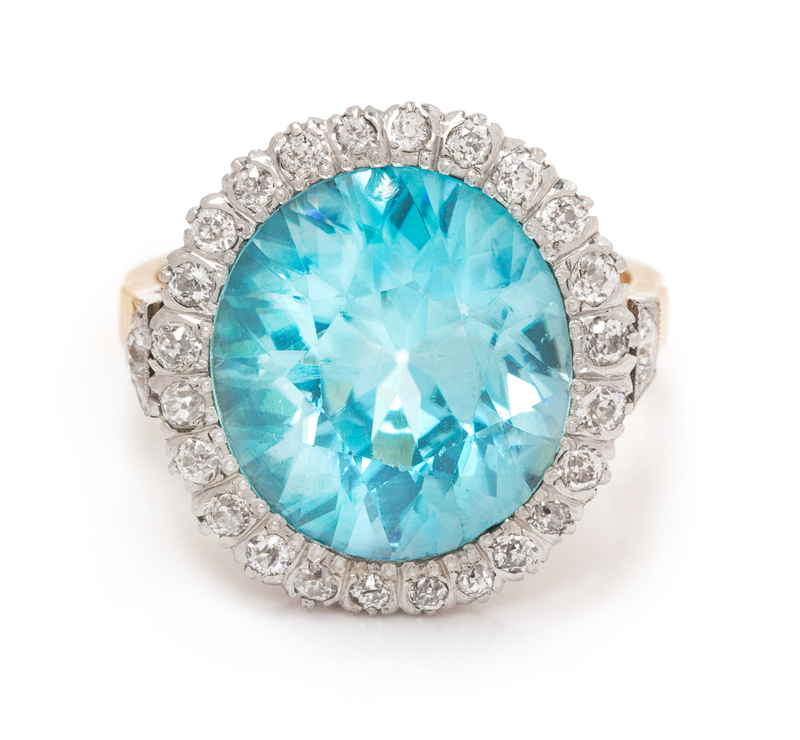 containing one oval brilliant cut blue zircon measuring approximately 15.50 x 13.60 x 8.20 mm, weighing approximately 15.30 carats, and 26 old mine and old European cut diamonds weighing approximately 0.80 carat total.