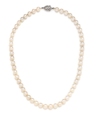 A Single Strand Cultured Pearl Necklace with a Platinum and Diamond Clasp,