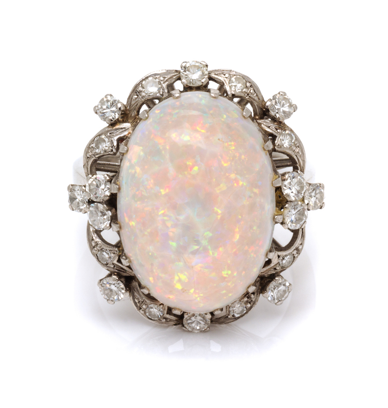 containing an oval cabochon cut opal measuring approximately 18.90 x 13.30 x 5.60 mm, 12 round brilliant cut diamonds weighing approximately 0.54 carat total and eight round single cut diamonds weighing approximately 0.14 carat total.
