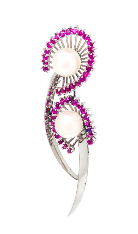 An 18 Karat White Gold, Ruby and Cultured Pearl Brooch,