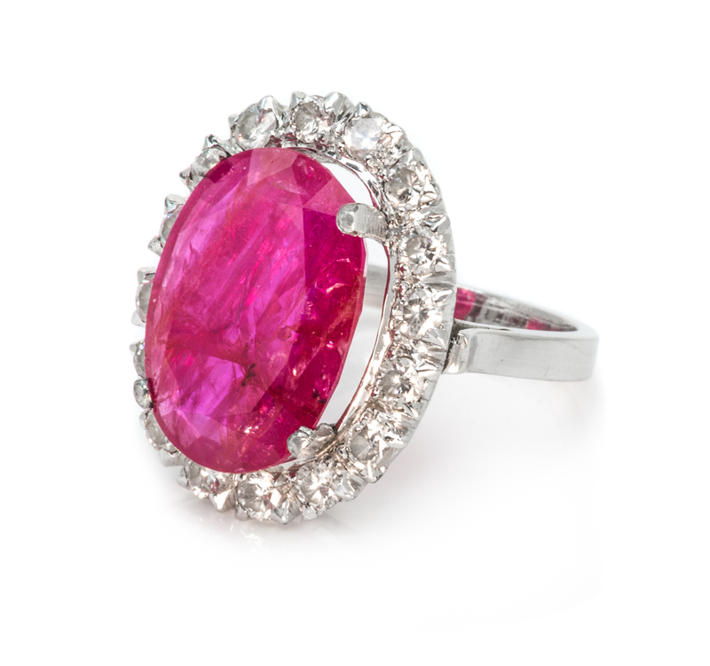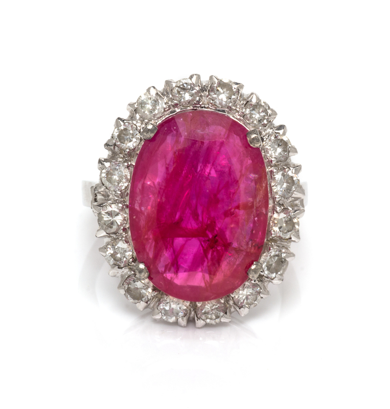 containing one oval mixed cut ruby measuring approximately 16.60 x 12.14 x 4.09 mm and 16 round brilliant cut diamonds weighing approximately 0.56 carat total.