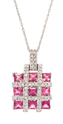 A 14 Karat White Gold, Pink Tourmaline and Diamond Pendant,