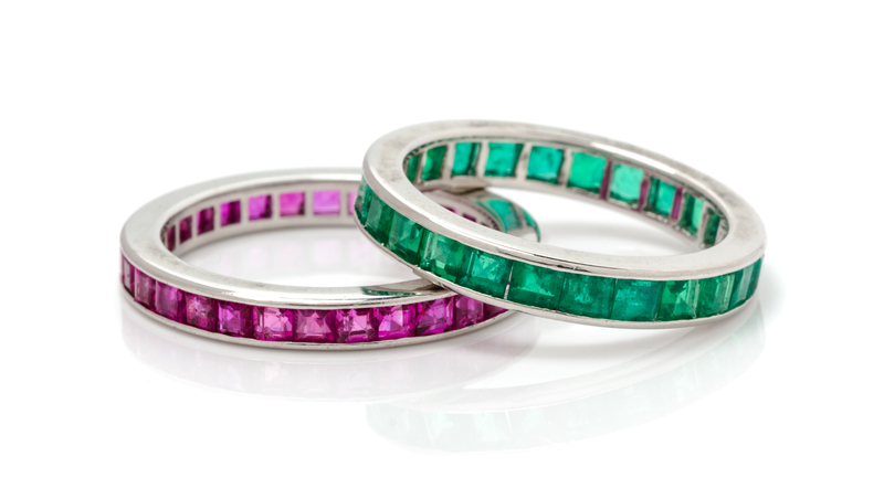 consisting of an eternity band containing numerous square step emeralds together with an eternity band containing numerous square step rubies.