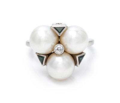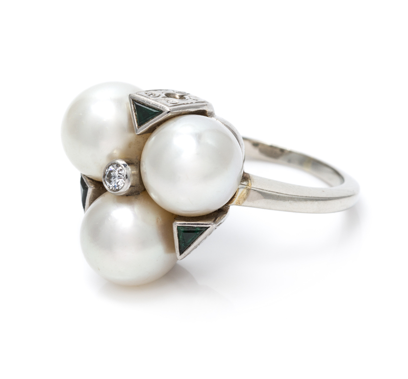 containing three pearls measuring approximately 8.25 mm in diameter, three triangular step cut emeralds measuring approximately 3.20 mm x 2.50 mm and one round brilliant cut diamond weighing approximately 0.04 carat Stamp: 14K.