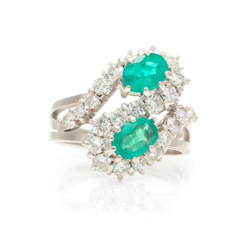 containing two oval mixed cut emeralds measuring approximately 7.00 x 5.39 x 3.95 mm, 23 round brilliant cut diamonds weighing approximately 1.25 carats total.Stamp: 750.