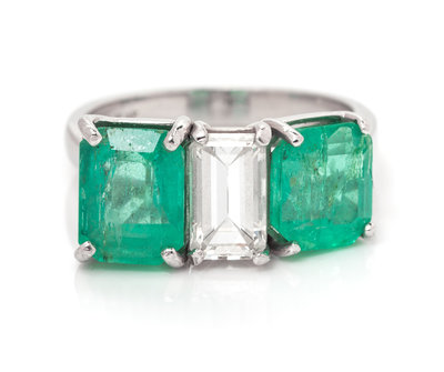 containing one octagonal step cut diamond weighing approximately 1.00 carat flanked with two octagonal step cut emeralds weighing approximately 1.90 carats and 1.57 carats respectively.Stamp: 10% IRID PLAT.