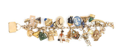 including a 14 karat gold and pearl dog charm, a gold and multigem Eiffel tower charm, an 18 karat gold Venetian gondola charm, a 9 karat gold clown charm, a yellow gold and jade Fu dog charm, a spider and glass charm, a yellow gold monogrammed fob charm, a yellow gold and cultured pearl clown charm, a silver and enamel fish charm, a Wedgewood charm, a yellow gold, turquoise and coral charm, a yellow gold Christmas tree charm, an 18 karat gold and wood Blackamoor charm by Corletto, a 14 karat gold and multigem bellboy charm, a yellow gold and cultured pearl hat charm, a 14 karat gold and polychrome enamel Swiss bell charm, a yellow gold and blue glass charm, a yellow gold winged lion St. Marks charm, a 9 karat gold Tudor figural charm, a 9 karat gold horse charm, a gold nugget charm, a nephrite carve Buddha charm, a 9 karat gold and smokey quartz horse charm, a 10 karat gold and diamond lion head charm, a rose gold monogram charm, a gold roadrunner charm, a 9 karat gold basket charm, together with a Rio suitcase charm.