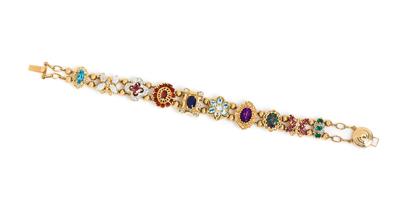 A 14 Karat Yellow Gold and Multigem Slide Charm Bracelet,