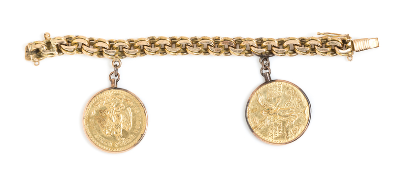 An 18 Karat Yellow Gold Bracelet with Two Attached 50 Pesos Coin Charms,