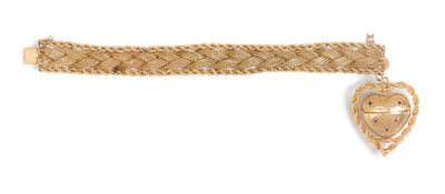 consisting of a heart shape locket with three folding oval photo frames, the outside containing five mixed cut rubies and five mixed cut sapphires, suspended from a woven mesh and rope chain bracelet.Stamp: 14K SHB.