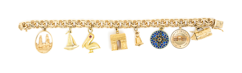 the bracelet in a double link design, the charms of various design including an articulated stein, a circular White House disk, a plique a jour enamel disk, an articulated Liberty bell, a sculpted Arc de Triomphe, a textured pelican, a sailboat, and an oval openwork Chicago charm.Bracelet stamp: 14K.