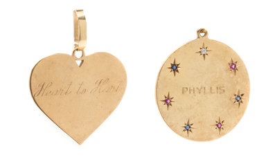 consisting of an 14 karat gold circular pendant containing three round mixed cut rubies and three round mixed cut sapphires measuring approximately 1.80 mm in diameter and one round single cut diamond weighing approximately 0.03 carat, together with yellow gold heart shaped pendant.Stamp: 14K.