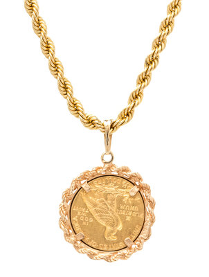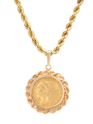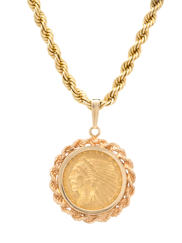 consisting of a US $2 1/2 Indian head gold coin, dated 1929, in a rope texture setting, suspending from an 14 karat yellow rope link chain.