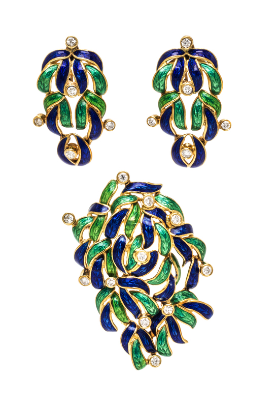 consisting of an articulated brooch containing 11 round brilliant cut diamonds weighing approximately 0.67 carat total and pair of earclips containing 10 round brilliant cut diamonds weighing approximately 0.53 carat total with green and blue enamel cascading leaves design.Stamp: CELLINO 18K.