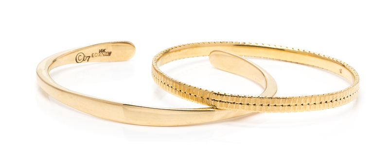 consisting of a modernist 14 karat yellow gold cuff bracelet together with an 18 karat yellow gold textured bangle bracelet.Stamp: 14K EORNEY (maker's mark)Stamp: 18K (maker's mark)